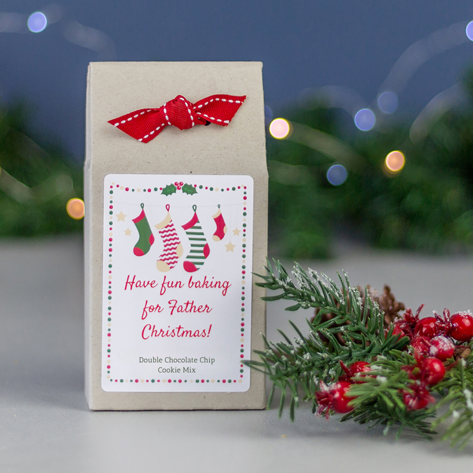 The Christmas cookie mix contains a delicious, foolproof Double Chocolate Chip Cookie mix, which is perfect for baking for Father Christmas or for fun over the holiday period. The box label can be personalised with your own message. Just enter your message in the relevant box when placing your order.