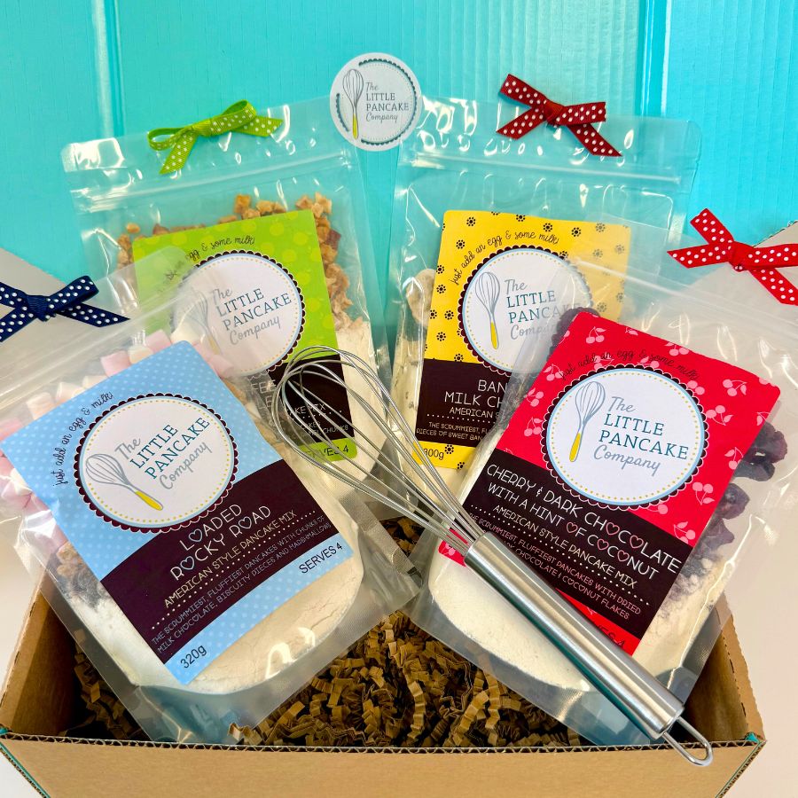 Perfect for any pancake lover, a gorgeous gift box filled with 4 gourmet pancake mixes of your choice and a whisk.