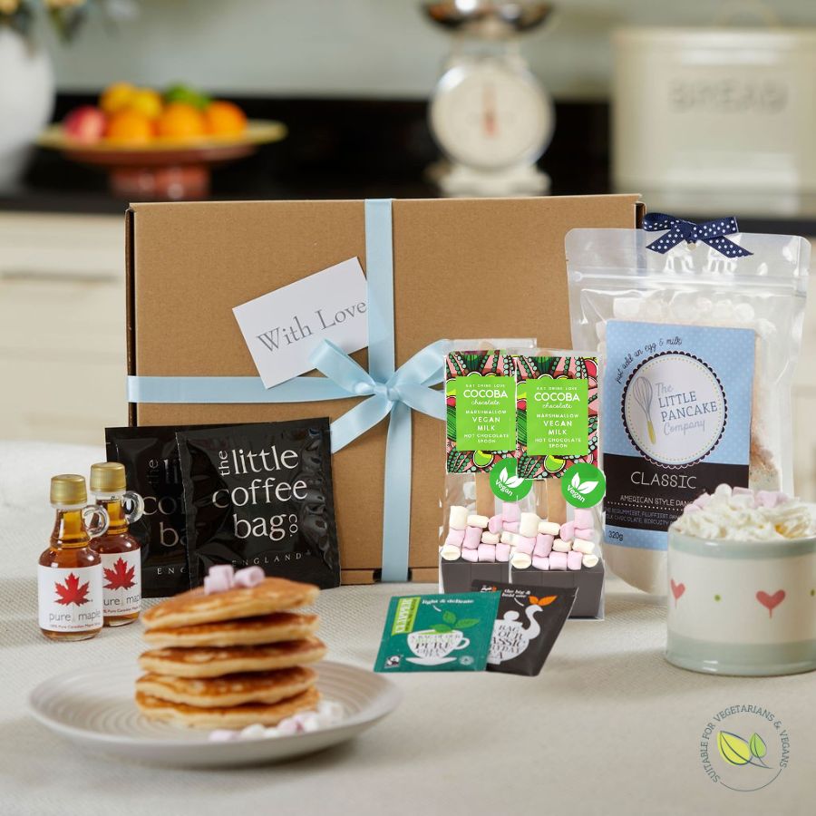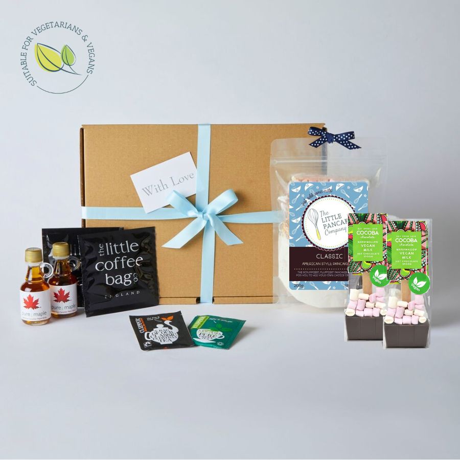 A beautifully presented Vegan gift set, perfect for anyone who loves pancakes and breakfast in bed. Includes a pancake mix, coffee, tea bags, hot chocolate spoons and maple syrup beautifully wrapped in a box.